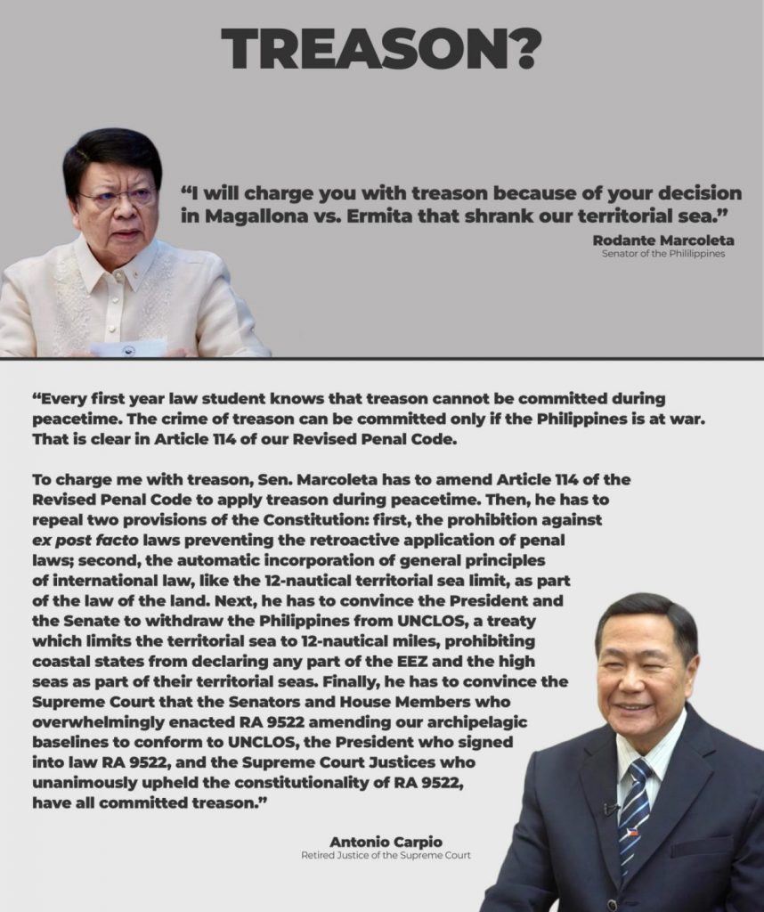 Retired Supreme Court Senior Associate Justice Antonio T. Carpio dismissed as baseless Senator Rodante Marcoleta’s threat to file a treason case against him over the 2011 Supreme Court ruling in Magallona v. Ermita, which upheld the constitutionality of Republic Act No. 9522, the Philippine Archipelagic Baselines Law.